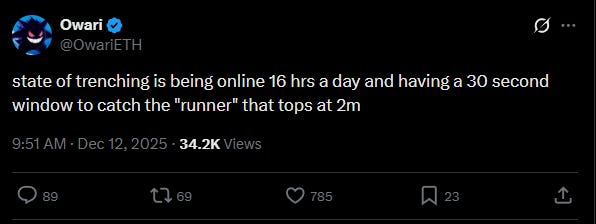Onchain trenching is probably the most negative sum game from a trader’s perspective, but too many people are addicted to gambling for a 100x that will never manifest itself.