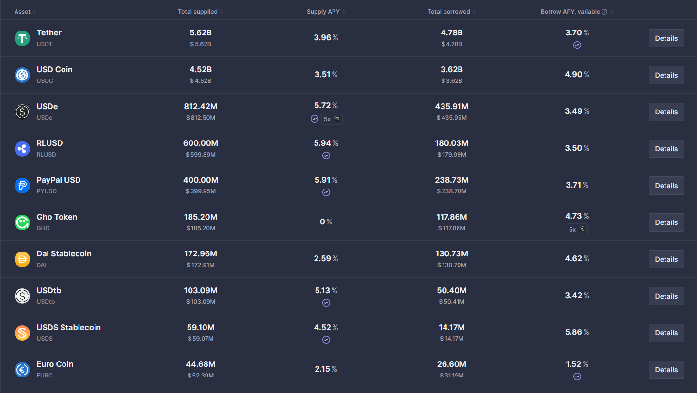 Pictured below are the lending APYs for stables on some major lending platforms on Ethereum mainnet.