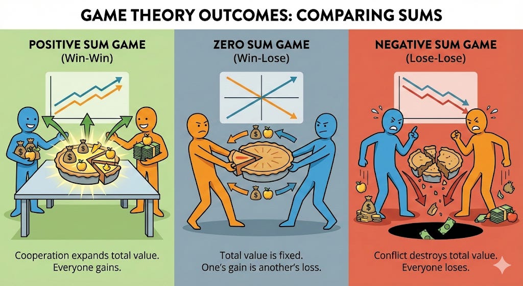 Generally, it’s better to play positive sum games instead of zero or negative sum games. Some simple reasons include: