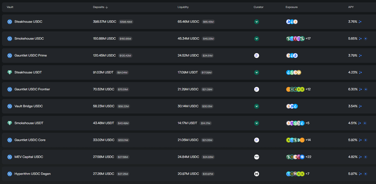 Many curated vaults are also exposed to a wide range of collateral of varying quality. As a quick example, this is what the Smokehouse USDC vault on Morpho lends to, a vault tailored for lending against higher risk collateral: