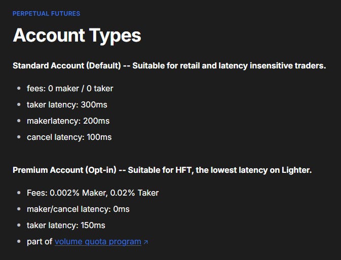Lighter has 2 account types: standard and premium. Standard accounts pay zero fees, but have a small added latency. Premium accounts are meant for MMs and have no added latency, but pay 0.2bps maker / 2bps taker fees. These fees make up the majority of Lighter’s revenue (the rest comes from liquidation fees).