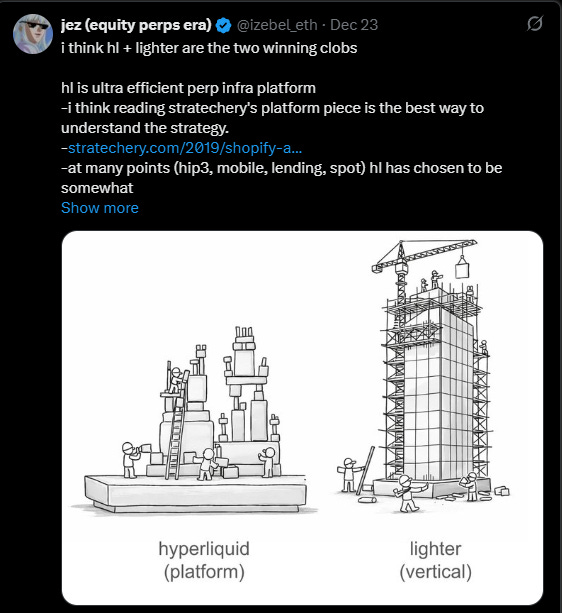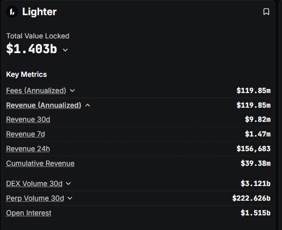 If you want to gain exposure to the perp dex sector, the only viable liquid token to bid right now is HYPE. However, at a $25 billion FDV, it’s not as attractive as it was at TGE (although I think it is a good buy at these prices!)Lighter is currently trading premarket at $3.5 billion FDV. That’s 14% of HYPE’s FDV, and is considerably more attractive considering that it’s the only viable competitor to HL and its metrics keep increasing.