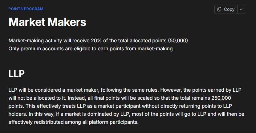 LLP earns points under this program, but points earned by LLP are redistributed to all users -> less points for MMs. LLP currently makes up <5% of maker volume, although I believe it was around 10-20% during the first few weeks of Season 2.